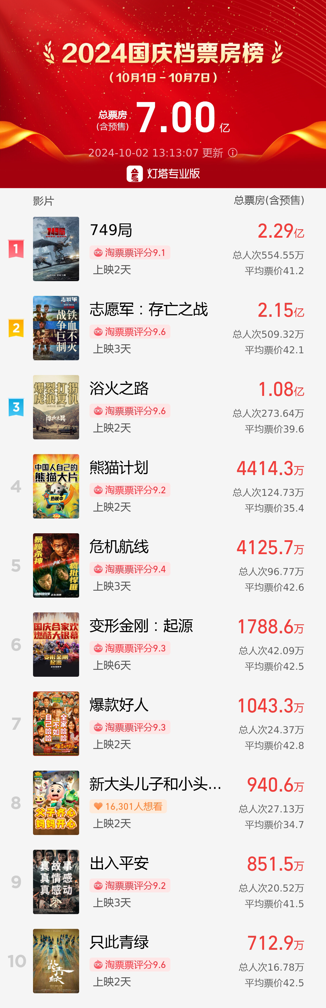 据灯塔业余版,年国妨碍10月2日13时13分,庆档2024年国庆档(10月1日—10月7日)档期内总票房(露预卖)突破7亿。票房破亿